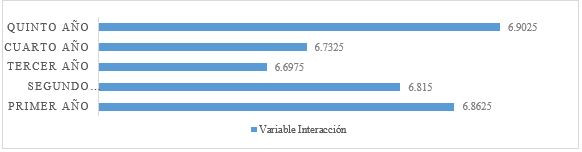 Ahora, para la variable de interacción, se aprecia que el quinto año es el que mayor interés despierta en los estudiantes, ya que es el momento donde deben cumplir con el servicio social en la Facultad de Contaduría y Ciencias Administrativas, además de que se encuentran en búsqueda, en la mayoría de las ocasiones, de su primer empleo, sin embargo, al momento de presentarles la oportunidad de integrarse a las actividades de investigación dentro de la FCCA, los alumnos no reflejan el interés mostrado en la investigación.