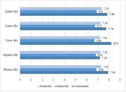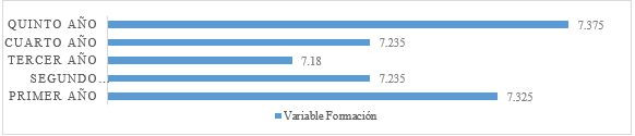Por último, la variable formación, muestra resultados similares a los de interacción, con un mayor interés en el quinto y primer año, contrario al tercer año, que presenta el interés más bajo de toda la investigación, ya que ahora entienden la necesidad de mantenerse actualizados y capacitados en sus áreas de interés.