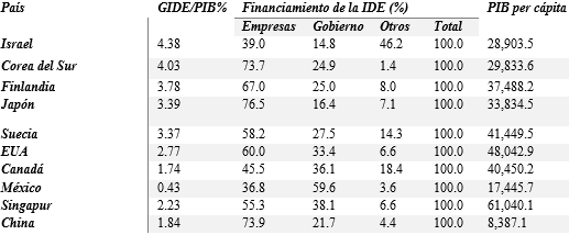 De manera paulatina, el sector empresarial ha decidido incrementar el recurso destinado al rubro ya mencionado, como se observa en la tabla 1, en el año 2011 los países con un GIDE en relación al PIB mayor al 2% fueron: Israel con 4.38%, Corea del Sur con 4.03%, Finlandia con 3.78%, Japón con 3.39%, Suecia con 3.37%, EUA con 2.77% y Singapur con 2.23%. Todos estos países tienen como principal fuente de financiamiento de la IDE al sector privado, con porcentajes de aportación mayores al 58.2%.