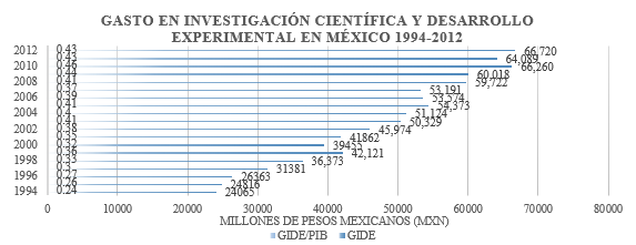El estudio indica que para la burocracia mexicana la ciencia nunca ha sido, ni es ahora, una prioridad, y que las comparaciones con países de potencia económica similar resultan desoladoras (Rivas & Aragón, 2003). En la gráfica 1 se observa el gasto en investigación científica en México de 1994 al año 2012, en ella se muestra que al año 2012 el GIDE era de 66,720 millones de pesos mexicanos, cifra equivalente al 0.43% del PIB.