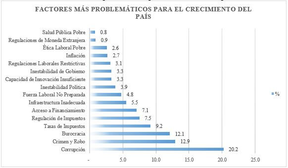 Los avances científicos están estrechamente relacionados con la competitividad de las naciones, por ello, en el índice global de competitividad 2017-2018, elaborado por Schwab (2017), se enlistan los 16 factores que afectan de mayor manera al crecimiento del país, en estos destaca la corrupción como el principal elemento con un 20.2%, seguido por el crimen y robo con el 12.9%, la burocracia con 12.1%, tasas de impuestos con 9.2% y la regulación de impuestos con 7.5%.