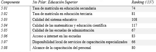 Estos elementos, a su vez, están compuestos por varios indicadores que se pueden comparar de manera general e individual. En particular, el quinto pilar se refiere a la educación. En la tabla 2 se observa el lugar que ocupa México en el ranking global para cada uno de los indicadores relacionados a la Educación Superior.