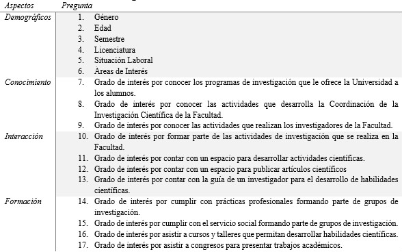 Se utilizó un cuestionario, el cual fue dividido en cuatro variables: demográfica, conocimiento, interacción y formación. Esto fue desarrollado con el objetivo de medir el interés de la comunidad estudiantil por las actividades científicas en el área económica-administrativa (tabla 4).