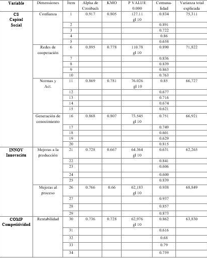 Se establecieron tres variables, con siete dimensiones distribuidas en 34 ítems (tabla 1). El capital social considera cuatro dimensiones: confianza (ítems del 1 al 5), redes de cooperación (ítems del 6 al 10), normas, actitudes y valores (ítems del 11 al 15) y generación de conocimiento (ítems del 16 al 20).