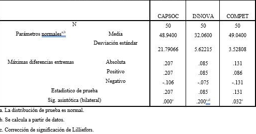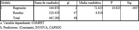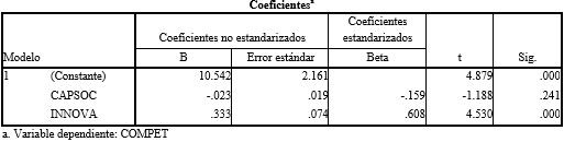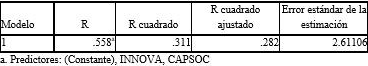 El R2indica que las variables que forman parte del modelo tienen una capacidad explicativa de la variabilidad de la competitividad del 55.8%, ajustando R2, se establece en 31.1%, lo que puede considerarse poco significativo. El capital social y la innovación solo influyen en un 31.1% en la competitividad, el resto por tanto es explicado por otras variables.