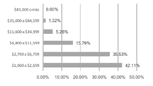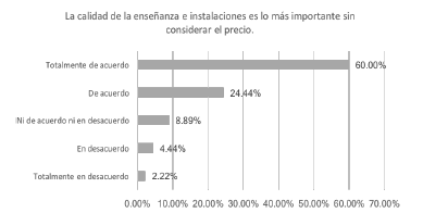 Las gráficas de izquierda a derecha de forma ascendente muestran que, de la población entrevistada, el 59% están interesados en tomar un curso de natación, de estos, poco más del 56% es jefe (a) de familia y la mayoría tienen ingresos de $1,900.00 a $2,699 (42%) y de $2,700.00 a $6,799.00 pesos (36%), lo que demuestra que el 71% de ellos están dispuestos a pagar una inscripción de $500.00 a $600.00 pesos y mensualidad de $800 a $900 pesos. Además, la distancia que están dispuestos a recorrer para llegar al CEA es de 1 a 2 kilómetros (44%). También algunas de las razones por las que tomarían un curso es para aprender a nadar (24%), otros que ya tienen conocimiento quieren mejorar la técnica (24%), otros por pasatiempo (15%) o por ejercicio (10%), entre otros. Asimismo, para la mayoría la calidad de la enseñanza e instalaciones es lo más importante sin considerar el precio (60%). De tal manera que los ingresos de los entrevistados, la ubicación, la calidad y el precio del CEA son factores determinantes para que asistan a los cursos. A continuación se presenta el último de los análisis realizados.