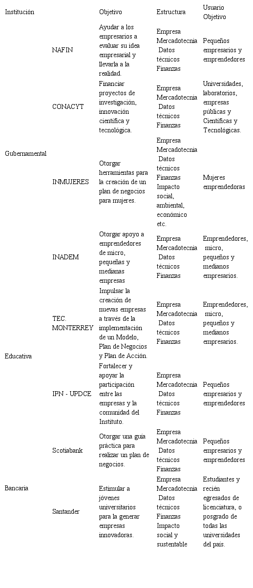 Actualmente existen diversas propuestas de planes de negocios por diferentes instituciones ya sean gubernamentales, educativas o bancarias, los aspectos más comunes que consideran son: 1. La información de la entidad; 2. Los técnicos; 3. Los de mercado y 4. Los financieros -económicos, tomando como prioridad para este trabajo los puntos tres y cuatro, pues la decisión para crear o desarrollar una empresa se basa en la viabilidad comercial y financiera del negocio que proporcionan los respectivos análisis. Como se observa en la tabla 1, el estudio de los aspectos de mercadotecnia y finanzas es recurrente en los planes de negocio analizados en este trabajo, por lo que se ahondará en estos apartados, ya que al iniciar un proyecto el emprendedor se requiere conocer la viabilidad comercial de la idea. Las decisiones que se toman implican: qué mercado servir, qué producto y/o servicio desarrollar, cuál es el objetivo que se quiere lograr y con qué recursos se cuentan para satisfacer a los clientes.