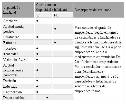 Al obtener resultados de la viabilidad de mercado y del económico – financiero se observa una reducción de incertidumbre ya que de manera objetiva se define la oportunidad de negocio. En lo que respecta a las capacidades y habilidades de un emprendedor, con la entrevista se observó que la persona que propicia ideas innovadoras son arriesgadas, creativas, con iniciativa y trabajadoras.