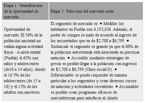 Para conocer la viabilidad de mercado de la creación del CEA se realizaron las dos primeras etapas del proceso de mercadotecnia (1. Identificación de la oportunidad de mercado y 2. Selección del mercado meta). En la primera etapa se buscó información respecto al mercado potencial (número de posibles consumidores, datos demográficos, hábitos de consumo, actividad física e interés en la práctica de la natación a nivel nacional y estatal, etc.) y la competencia, con el fin de identificar la viabilidad de mercado para el nuevo centro. Los pasos que se realizaron para encontrar la oportunidad de mercado fueron los siguientes: 1. Análisis del micro entorno, 2. Análisis del macro entorno (lo que conforma el Sistema de Información de Mercadotecnia - SIM) y 3. Aplicación de la matriz DAFO (debilidades, amenazas, fortalezas y oportunidades).