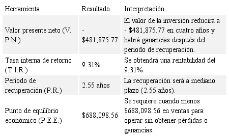 Al igual que en el análisis de mercado, en el aspecto económico-financiero se realizaron diversas actividades para determinar la viabilidad. En la entrevista semiestructurada a la emprendedora se logró conocer sus intereses en cuanto a organizaciones y tipos de financiamiento de los que tenía conocimiento. De tal forma que se compararon diversos planes de negocios de instituciones gubernamentales, educativos y bancarios y los requisitos que cada uno de ellos solicita al emprendedor. Además y de acuerdo con los deseos e intereses de la misma, se realizaron los gastos y costos del proyecto para obtener el flujo de efectivo además de la proyección de ventas e ingresos esperados. Con ello fue posible aplicar las herramientas de valor presente neto (VPN), tasa interna de retorno (TIR), periodo de recuperación (P.R) y punto de equilibrio económico (P.E.E.). Es así que, para encontrar la viabilidad económica-financiera se realizaron los flujos de efectivo por un periodo de cuatro años, posteriormente se procedió con el análisis de las herramientas antes mencionadas obteniendo los resultados que se muestran en la tabla 5.