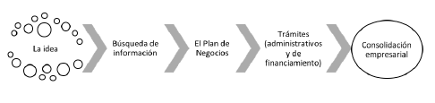 El tercer elemento del emprendimiento es el proceso o círculo de vida del emprendedor, definido como una sucesión de tareas o pasos para llegar a un objetivo (Uribe y de Pablo, 2011:4, 5). La figura 1 muestra la primera etapa como la idea, la cual ha de cubrir una oportunidad de negocio, un hueco en el mercado, una necesidad insatisfecha o no cubierta de la forma más apropiada; la segunda tarea es la búsqueda de la información del mercado e instituciones que den ayuda técnica a los emprendedores; el tercer paso es el plan de negocios, definido como el documento donde se ponen de forma coherente, realista, sistemática y pormenorizada, las acciones a emprender y llevar a cabo, de manera controlada para lograr los objetivos específicos y obtener resultados concretos; la cuarta etapa tiene que ver con los trámites administrativos y de financiamiento necesarios para estimar en materiales y recursos financieros lo que la empresa necesita para su funcionamiento y la última etapa del ciclo es la consolidación empresarial.