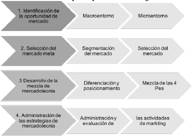 El proceso de mercadotecnia que se considera más claro es descrito por Kotler y Armstrong (2013). Este consta de cuatro etapas, inicia con la identificación de oportunidades de mercado y concluye en la administración estratégica de la mercadotecnia; es decir, hay una propuesta de actividades y su evaluación (figura 2).
