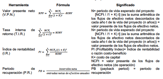 Al evaluar la viabilidad de los planes de negocios se da respuesta al objetivo de crear riqueza de quién arriesga su inversión mediante la sistematizan los datos financieros para propiciar el flujo corriente de información que a su vez es el insumo para la toma de decisiones y del análisis financiero. Éste último definido como “la aplicación de técnicas y métodos que tienen como objetivo proporcionar elementos de juicio suficientes para interpretar la situación financiera de la empresa” (Ortega, 2008:22). Para el caso de emprender un nuevo proyecto o negocio es necesario conocer la viabilidad de éste asegurando a la vez el mínimo de riesgos posibles. Para esto se cuenta con diversas herramientas que dan pauta a las decisiones de inversión (tabla 2). La mayoría de estas herramientas tienen un criterio de decisión para aceptar o rechazar el proyecto. En el caso del valor presente [V.P.N.] se acepta el proyecto si el resultado es mayor o igual a cero; para la tasa interna de retorno [T.I.R.] se acepta el proyecto si el resultado es mayor o igual al costo del capital de la empresa, de igual modo es aceptable si el resultado del índice de redituabilidad [I.R.] es igual o mayor a 1 y en cuanto al periodo de recuperación [P.R.] aunque no tiene regla de decisión, generalmente es de tres años y se deja la decisión al emprendedor.