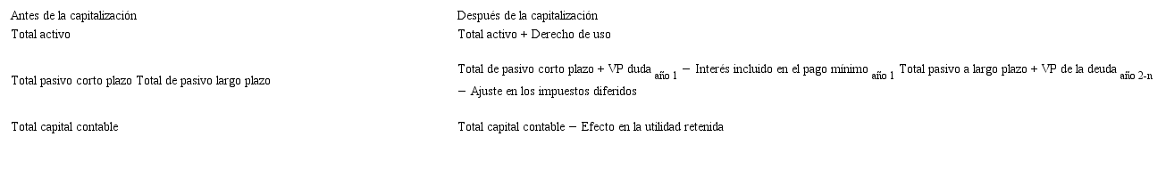 El efecto en el balance general se aprecia en la tabla 2 donde se puede observar un incremento en el total de los activos producto del reconocimiento del derecho de uso, la cantidad de activo que se reconozca dependerá de los años de vida remanente de los contratos de arrendamiento. El pasivo circulante, por su parte, se verá incrementado al incorporar el valor presente del monto mínimo a pagar por arrendamiento el siguiente año y disminuido a su vez por el interés incluido en el pago mínimo del siguiente año. De igual forma, el pasivo a largo plazo se aumenta por el valor presente del resto de los pagos mínimos del contrato, pero se disminuirá por el efecto en los impuestos que ocasiona la diferencia entre el valor reconocido como derecho de uso y valor presente de la deuda total. Por último, el capital contable se verá disminuido por el efecto que genera en las utilidades retenidas la capitalización.