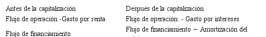En el estado de flujos de efectivo, la capitalización no generará en sí un cambio en el flujo neto, el efecto será solo de reclasificación ya que el gasto por renta se clasificará una parte como gasto por intereses y la otra como amortización del pasivo, generando un incremento en el flujo de operación por la eliminación del gasto por renta pero disminuyéndose a su vez por el gasto por interés. Por su parte, el flujo financiamiento se verá disminuido por la incorporación pago del pasivo. La tabla 4 presenta el efecto de la capitalización en el estado de flujos de efectivo.