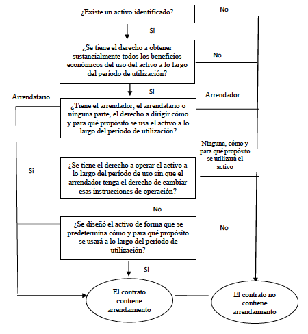 En el reconocimiento de la existencia de un arrendamiento en un contrato, primeramente, se deberá determinar si el contrato es o contiene un arrendamiento, es decir, si transmite el derecho a controlar el uso de un activo identificado por un periodo de tiempo a cambio de una contraprestación. Esto requerirá que el preparador de la información aplique su juicio profesional, el cual será requerido de igual forma para identificar si el contrato de arrendamiento contiene uno o varios componentes requiriendo que cada componente o grupo de componentes se contabilice en forma separada. La figura 1 ilustra el proceso de identificación propuesto por el IASB para la determinar si existe o no un arrendamiento en el contrato.