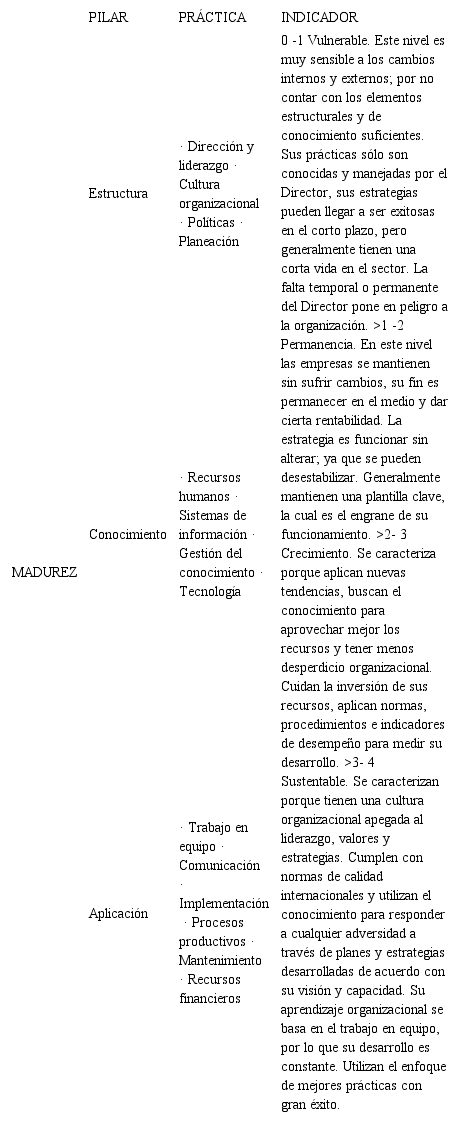 La administración de las organizaciones de este sector es compleja y se entiende que el éxito depende de la habilidad de los directivos, y más aún cuando se quieren iniciar cambios rápidos. El modelo de madurez es una herramienta diseñada para ayudar a administrar el cambio, ya que el empresario tiene que pensar en personas vinculadas con: máquinas y procesos; capital intelectual y financiero; espacios de planeación y aprendizaje; y, espacios de producción y de acción.