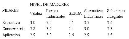 La empresa Velalux, aunque con un nivel de madurez menor, muestra un equilibrio en sus pilares. En esta empresa se encontró la particularidad de que sus directivos han realizado estudios de posgrado en áreas administrativas.