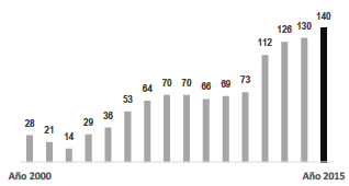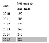 La asistencia a las salas de cine es otro indicador interesante para fines de este estudio. En la tabla 1 se puede apreciar que para el 2010 se registraron 190 millones de asistencias. Para el 2015 la cifra se incrementó a 286 millones, lo que representa un incremento de 50 por ciento más.