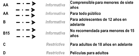 Ø AA. Comprensible para menores de siete años. La clasificación es de carácter informativo. Son películas que presentan una narrativa fácil de comprensión y por lo tanto la que mayor mercado abarca. No contiene escenas eróticas ni sexuales además de que tampoco hace uso de lenguaje altisonante ni consumo de estupefacientes o psicotrópicos por lo que no es sujeta a censura. No hay horror. La violencia puede ser mínima. Los besos, abrazos o caricias se presentan en tono cariñoso, familiar o amistoso. No afecta el desarrollo integral de un menor de siete años. No tiene ningún tipo de censura para verla.