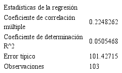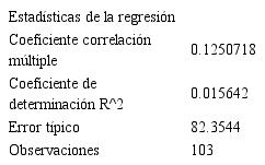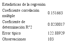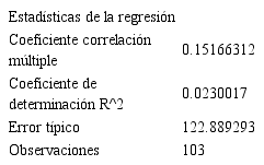 En la tabla 2 se aprecia un coeficiente de determinación R. de 0.02 es decir, el grado en el que el modelo explica el comportamiento de la variable dependiente con respecto a las independientes o bien, la relación que hay de las . con la .. Con el valor arrojado, el modelo no es confiable tomando en cuenta la orientación hacia las ciencias sociales que tiene este estudio.
