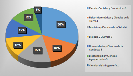 La formación de investigadores en México al formar parte del Sistema Nacional de Investigadores, se someten a evaluaciones por pares externos, quienes valoran la productividad científica del postulante, formación de recursos humanos de alto nivel, dirección o codirección de tesis en licenciatura y posgrado, publicación de artículos científicos de alto impacto. Distribuidas en siete áreas del conocimiento: I) Físico-Matemáticas y Ciencias de la Tierra, II) Biología y Química, III) Medicina y Ciencias de la Salud, IV) Humanidades y Ciencias de la Conducta, V) Ciencias Sociales y Economía, VI) Biotecnología y Ciencias Agropecuarias y VII) Ingeniería (Figura 2).