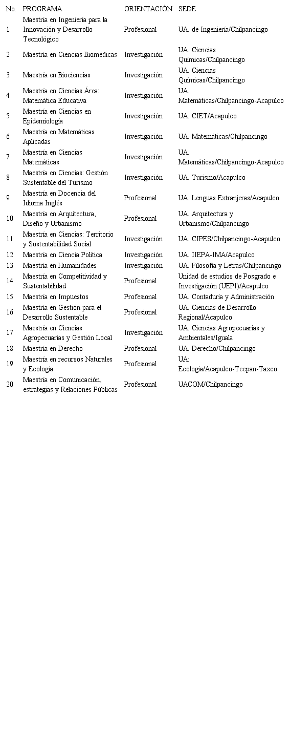 UAGro (2015). Programas educativos de posgrado de la Universidad Autónoma de Guerrero, acreditados en el PNPC-Conacyt (Maestrías). México: Universidad Autónoma de Guerrero.