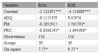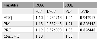 In this section, the research findings are presented, where the panel study is developed and for this we had to create two models, one to measure the ROA and the other of the ROE, for the above it was necessary to first analyse the inflation factor of the variance, which is necessary to provide if there is a low collinearity (Gaytan-Cortes, 2016), which must be between 1 and 10 to accept this criterion, as shown in table 1.