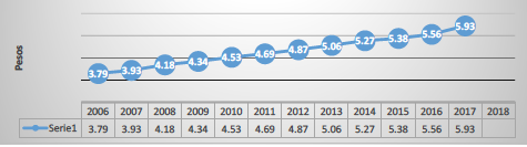 Fuente: Elaboración propia con cifras proporcionadas por el Banco de México e Instituto Nacional de Geografía y Estadística. http://www.inegi.org.mx/sistemas/bie/ (consultado en junio 10 de 2018) Ruta temática: Indicadores económicos de coyuntura > Indicadores financieros > Tipo de cambio del peso respecto al dólar y valor de las UDIS > Valor de las unidades de inversión (UDIS)