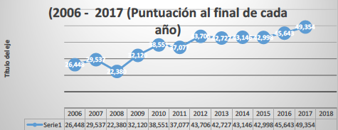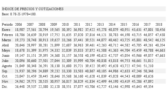 Fuente: Elaboración propia con cifras proporcionadas por el Bolsa Mexicana de Valores e Instituto Nacional de Geografía y Estadística. http://www.inegi.org.mx/sistemas/bie/ (consultado en junio 10 de 2018) Ruta temática: Financiero y bursátil > Indicadores financieros y bursátiles > Índice de precios y cotizaciones de la Bolsa Mexicana de Valores > Último índice del mes