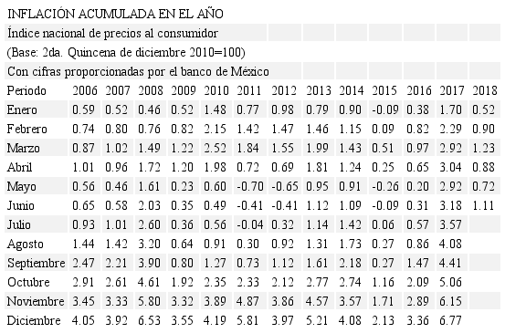 Fuente: Elaboración propia con cifras proporcionadas por el Banco de México e Instituto Nacional de Geografía y Estadística. http://www.inegi.org.mx/sistemas/bie/ (consultado en junio 10 de 2018) Ruta temática: Precios e inflación > Índice nacional de precios al consumidor >Mensual > Índice > Índice general y por objeto del gasto > Índice general