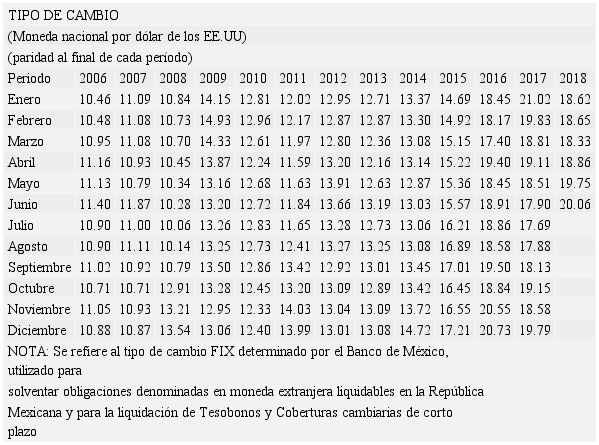 Fuente: Elaboración propia con cifras proporcionadas por el Banco de México e Instituto Nacional de Geografía y Estadística. http://www.inegi.org.mx/sistemas/bie/ (consultado en junio 10 de 2018) Ruta temática: Financiero y bursátil > Indicadores financieros y bursátiles > Cotización del dólar en el mercado cambiario nacional > Tipo de cambio para solventar obligaciones en moneda extranjera > Cotizaciones al cierre del mes. Venta