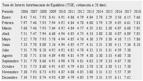 Fuente: Elaboración propia con cifras proporcionadas por el Banco de México e Instituto Nacional de Geografía y Estadística. http://www.inegi.org.mx/sistemas/bie/ (consultado en junio 10 de 2018) Ruta temática: Financiero y bursátil > Indicadores financieros y bursátiles > Tasas de interés bancarias > Tasa de interés interbancaria de equilibrio (TIIE) >A 28 días (al cierre del mes)