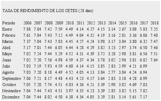 Fuente: Elaboración propia con cifras proporcionadas por el Banco de México e Instituto Nacional de Geografía y Estadística. http://www.inegi.org.mx/sistemas/bie/ (consultado en enero 12 del 2018) Ruta temática: Financiero y bursátil > Indicadores financieros y bursátiles > Tasas de rendimiento en instrumentos del mercado primario > Certificados de la Tesorería de la Federación (CETES) > 28 días