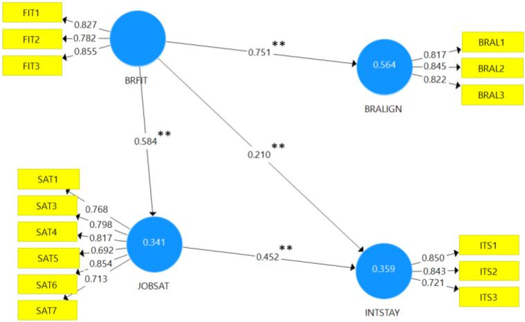 El diagrama de estimación del modelo estructural se muestra en la Figura 1. Todos los coeficientes de trayectoria tienen signos positivos como se postuló en las hipótesis, y son significativos al nivel de 1% (representado en la figura con un doble asterisco). Las R2 de las variables endógenas oscilan entre 0.341 para JOBSAT y 0.564 para BRALIGN. De acuerdo con Chin (1998), los valores de R2 de 0.67, 0.33 y 0.19 se pueden caracterizar como sustanciales, moderados y débiles, respectivamente.