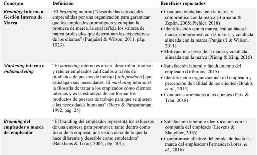 A pesar del aumento en el número de publicaciones, el branding interno es todavía una corriente de investigación reciente. Indicio de ello es que, hasta 2018, se había publicado tan sólo un número especial dedicado al branding interno en una revista de investigación de marketing, concretamente el Journal of Brand Management (Piehler et al., 2018). Al día de hoy, los investigadores no han llegado a una definición generalmente aceptada. Además, como ya se mencionó, ha surgido en la literatura una confusión de conceptos entre el branding interno, el branding del empleador o marca del empleador, y el marketing interno o endomarketing como se le suele llamar en Brasil (de Farias, 2010). En su revisión crítica de la “fragmentada” literatura de branding interno, Saleem e Iglesias (2016) señalan que algunos utilizan este concepto como sinónimo del branding del empleador (Aurand et al., 2005), o del marketing interno (Backhaus & Tikoo, 2004), aunque las tres corrientes se diferencian por los constructos e hipótesis que han investigado. En México, el marketing interno y el branding del empleador son estudiados hace tiempo (Figueroa & Serralde, 2003; Blasco et al., 2014), no así el branding interno. Para efectos ilustrativos, la Tabla 1 recoge definiciones ampliamente citadas de los tres conceptos, y los beneficios típicos que han sido reportados en los estudios. Dentro de la extensa literatura sobre gestión de marca, el presente trabajo se encuadra en la corriente de branding interno, y es congruente con la definición postulada por Punjaisri y Wilson (2011).