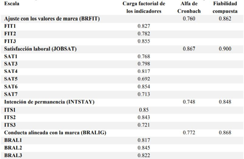 Los constructos utilizados en este estudio han aparecido frecuentemente en investigaciones de branding interno, por lo que para su medición se pudo contar, en todos los casos, con escalas previamente publicadas y validadas. En concreto, el ajuste con los valores de marca se midió con la escala de tres reactivos propuesta por Xiong y King (2015). La conducta alineada con la marca se midió con la escala de tres reactivos de comportamiento consistente con la marca de King y So (2015). La satisfacción laboral se midió con siete reactivos tomados de la escala de Du Preez y otros (2017). La intención de permanencia se midió con tres reactivos adaptados de la escala de Du Preez y otros (2017). Todos los reactivos fueron evaluados con una escala Likert de siete puntos, abarcando desde “En fuerte desacuerdo” hasta “En fuerte acuerdo”.