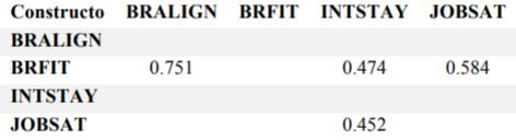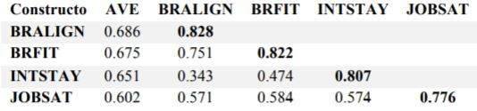 Además de los efectos directos representados por los coeficientes de trayectoria, hay que explicitar el impacto total sobre la intención de permanencia. La Tabla 5 muestra los efectos totales calculados por el programa SmartPLS sobre las tres variables dependientes del modelo, a saber, conductas alineadas con la marca, satisfacción laboral e intención de permanecer. La tabla revela que en el caso de las primeras dos, dicho efecto coincide simplemente con el coeficiente de trayectoria ya mostrado en la Figura 1. En cambio, para la intención de permanencia, el efecto total del ajuste con los valores de marca es 0.474, compuesto por el efecto directo, 0.210, más el efecto indirecto mediado por la satisfacción laboral, que alcanza 0.264. Esto significa que un aumento de una desviación estándar en la variable independiente BRALIGN se traduce en un aumento total de 0.474 desviaciones estándar en la variable endógena INTSTAY.