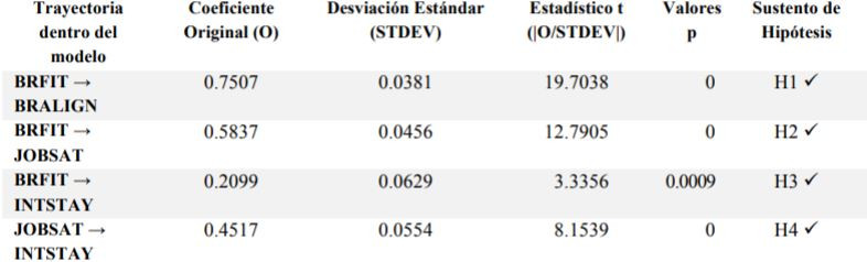 Ninguno de los estudios mencionados examinó la relación entre el ajuste con los valores de marca del empleado y su satisfacción laboral e intención de permanencia. Tomando en consideración la importancia que tendrían dichas relaciones, y teniendo presente que el ajuste con los valores de marca de los empleados es una de las variables prioritarias sobre las procuran incidir los programas organizacionales de branding interno, se proponen las siguientes hipótesis: