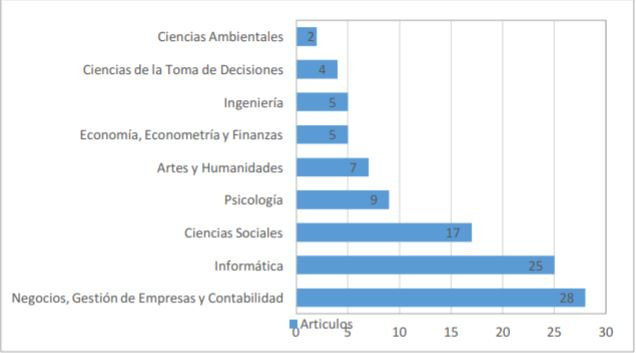 La figura 10 muestra una gráfica de barras con todas las disciplinas en las que se ha escrito sobre eWOM y el proceso de toma de decisiones. La disciplina en la que más se escribe es Negocios, Gestión de empresas y Contabilidad con 28 artículos, seguido de Informática con 25, y en tercer lugar Ciencias Sociales con 17. A estos tres primeros le siguen Psicología con 9; Artes y Humanidades con 7; Economía, Econometría y Finanzas, así como Ingeniería con 5; Ciencias de la Toma de Decisiones con 4 y, finalmente, Ciencias Ambientales con 2.