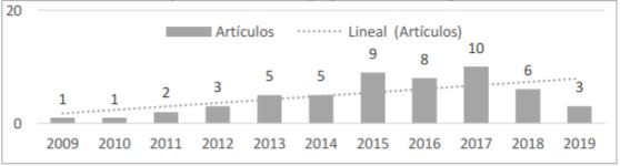 Este estudio es un análisis bibliométrico realizado con artículos incluidos en la base de datos SCOPUS (Elsevier, 2019), que contiene 18 mil artículos aproximadamente de más de cinco mil editores internacionales, incluyendo la cobertura de 16,500 revistas arbitradas por pares en las áreas de ciencia, tecnología, medicina y ciencias sociales, incluyendo artes y humanidades (Elsevier, 2019). El análisis biblométrico se realizó con base al cierre de la base para 2019, abarcando un periodo de publicación sobre el tema de una década.