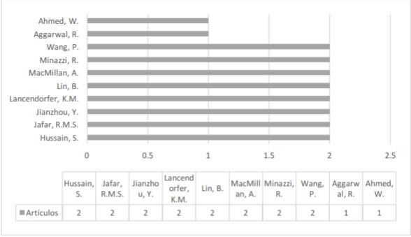 Entre los autores que han escrito sobre el tema se identificaron 136 que han publicado sobre eWOM asociado con la toma de decisiones del consumidor, de los cuales el 94.11% (n=128/136) han publicado solamente un documento y el 5.88% (n=8/136) restante solamente dos artículos.