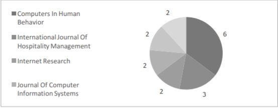 En cuanto a las revistas que más referencian a los autores, de los 53 artículos resultantes, la principal es Computers in Human Behaviorcon seis artículos, seguida de International Journal of Hospitality Management con tres, y el resto solamente con dos artículos: Internet Research, Journal of Computer Information Systems . Journal of Internet Commerce, como se muestra en la Figura 3.