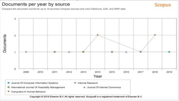 La revista que sigue en importancia durante estos 10 años es Journal of Internet Commerce (línea en color morado), iniciando actividad en 2012 y siendo constante hasta 2016 con un artículo consecutivo, año con año. El resto de las revistas sólo tienen contribución en dos años consecutivos o una publicación por año, no siendo relevantes al contribuir a la relación entre eWOM y la toma de decisiones del consumidor (Elsevier, 2019).