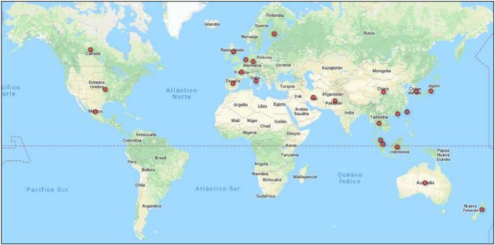La publicación de articulos, que abordan el eWOM y la toma de decisiones del consumidor en los diez años estudiados, están distribuidos en 23 países, el 47.82% son asiáticos (n=11/23); 30.43% son europeos (n=7/23). Norteamérica representa el 13.04% (n=3/23) y Oceanía el 8.69% (n=2/23). La Figura 5 muestra la distribución por países.