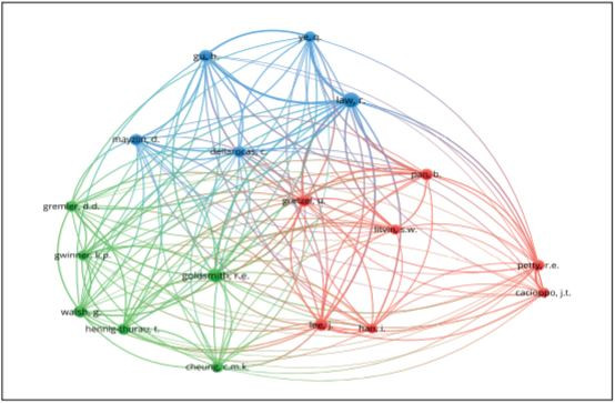 La Figura 7 muestra la red que se establece entre algunos autores que trabajan en conjunto y publican (Ardanuy & Rey, 2009), que mucho tiene que ver con las colaboraciones y tratados entre instituciones academicas y/o países. El patrón que se muestra en la Figura 7, son tres clústeres principales con los autores clave: Henning-Thurau y otros (2004) en color verde; Dellarocas y otros (Dellarocas et al. 2007; Dellarocas, 2006) en color Azul; y como tercero, Pan y Chiou (2011) en color rojo claro. Este tipo de gráfica muestra cómo, entre estos tres clústeres, los autores principales trabajan en conjunto y son citados entre sí por escribir artículos con los mismos temas. El resto de autores que forman parte de cada clúster, son partícipes, pero no llegan a ser tan importantes como para crear un clúster. En el azul, aparte de Dellarocas (2006) el autor principal, tenemos como autores a Chevalier y Mayzlin (2004), así como a Rong y otros (2012).