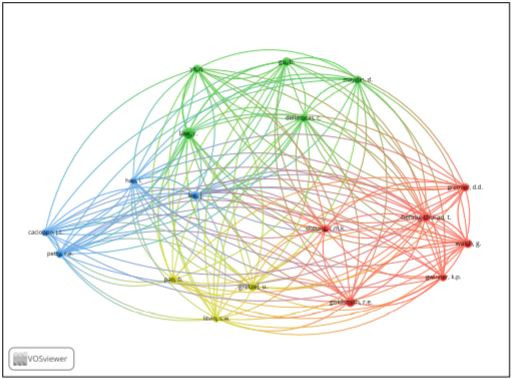 La cocitación, por otro lado, en comparativa con la red de cooperación, es cuando dos autores o más son citados en conjunto ( Fagerberg, Fosaas & Sapprasert, 2012). Cuando se cita, se utiliza a los primeros autores. Pero si ocurre que en forma frecuente y significativa escriben estos autores, es porque colaboran mejor que en forma separada. En la Figura 8, se muestra el resultado de la cocitación entre los autores principales que han escrito o publicado sobre eWOM y la toma de decisiones del consumidor. La cocitación de la figura 8, por tanto, representa el nexo existente entre los autores con un color en específico. El análisis de las cocitas es utilizado para medir el impacto e importancia en las investigaciones (Pinar et al., 2012). Se identificaron cuatro redes principales de colaboración, destacadas con los colores verde, azul, amarillo y rojo.