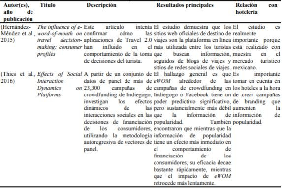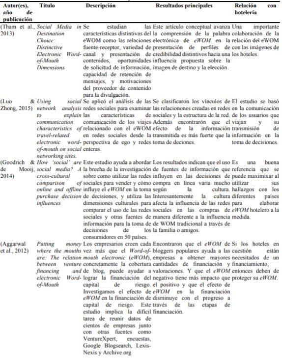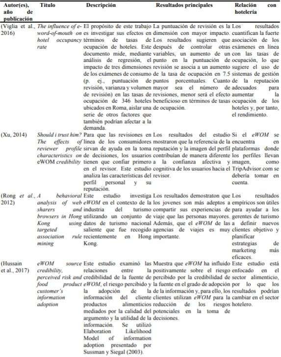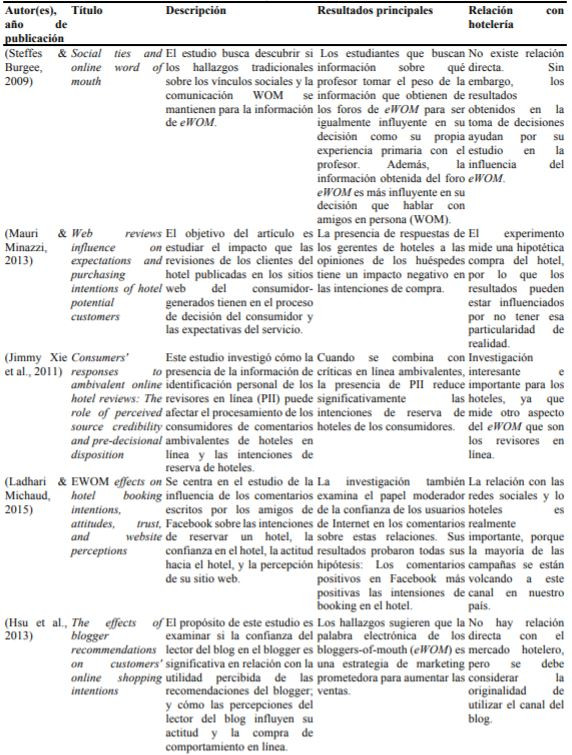 Se hizo una revisión de la literatura científica relacionada con el tema, correspondiente a la década pasada (Cheng & Zhou, 2010; Glasgow et al., 2017; Yang, Wang & Lai, 2014; You, Vadakkepatt, & Joshi, 2015). Cada uno de estos trabajos se enfocó en diversos tipos de productos o servicios, aumentado el conocimiento del eWOM. Debido al rápido crecimiento de este fenómeno, es necesaria una actualización sobre los avances realizados en estos últimos años.