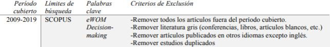 En la Tabla 1, se muestran los resultados de las cinco fases aplicadas a este estudio. Los artículos analizados se tomaron el 18 de mayo del 2019 de la base de datos SCOPUS. Se obtuvo una base de datos que arrojó de inicio 73 documentos en total, incluida toda la literatura gris: 53 artículos, 15 conferencias, 5 reseñas, 1 capítulo de libro y 1 artículo en prensa (artículo blanco), abarcando el periodo de 2009 al 2019. Se aplicaron los criterios de exclusión y finalmente se trabajó con 53 artículos en inglés. La búsqueda se realizó con los términos en el idioma inglés (eWOM + decisión-making), debido a que en español existen muy pocos o casi ningún artículo con los dos temas en conjunto (Elsevier, 2019).