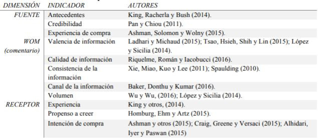 En la Tabla 2 se muestran las principales dimensiones e indicadores del eWOM como se ha estudiado hasta el momento, dividiendo el eWOM en tres principales partes: la fuente (quién emite el comentario), el comentario en sí o eWOM, y el tercero el receptor (quién recibe el comentario). Así como los indicadores con los que se han medido hasta hoy día.